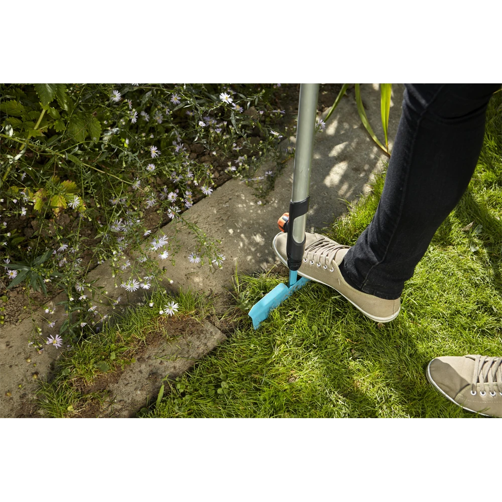 De GARDENA combisystem-graskantafsteker is uitermate geschikt om de rand van het gazon recht af te steken, zodat bloemperken duidelijk zijn afgescheiden van het gazon. Met de scherpe en geharde stalen rand in de vorm van een halve maan is dit heel eenvoudig. De graskantafsteker is geschikt voor alle stelen van het GARDENA combisystem, waarbij GARDENA een steellengte van 130 cm adviseert, afhankelijk van uw lichaamslengte.