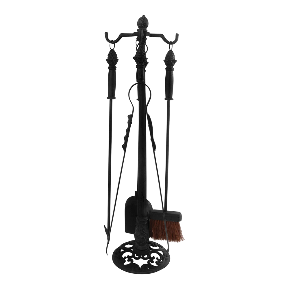 Wat is er gezelliger dan tijdens koude avonden het geluid te horen van een knisperend haardblok. Deze klassieke haardgereedschapset bestaat uit vier stuks gereedschap en een staander met sierlijke krullen. Bij deze set worden een schep, een pook, een tang en een bezem geleverd, dit om de haard optimaal te kunnen onderhouden. Het gereedschap is ideaal voor het opruimen en schoonmaken van de haard. De gietijzeren onderdelen zijn met de hand gegoten volgens eeuwenoud vakmanschap en traditie.
